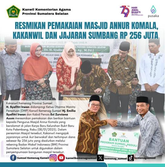 Dalam kesempatan peresmian tersebut Syafitri Irwan mengajak seluruh jajaran Kantor Wilayah Kementerian Agama Provinsi Sumatera Selatan untuk menyalurkan wakaf melalui uang untuk membantu penyelesaian masjid tersebut. Alhamdulillah dalam moment tersebut terkumpul dana Wakaf melalui uang sebesar 256 Juta Rupiah.